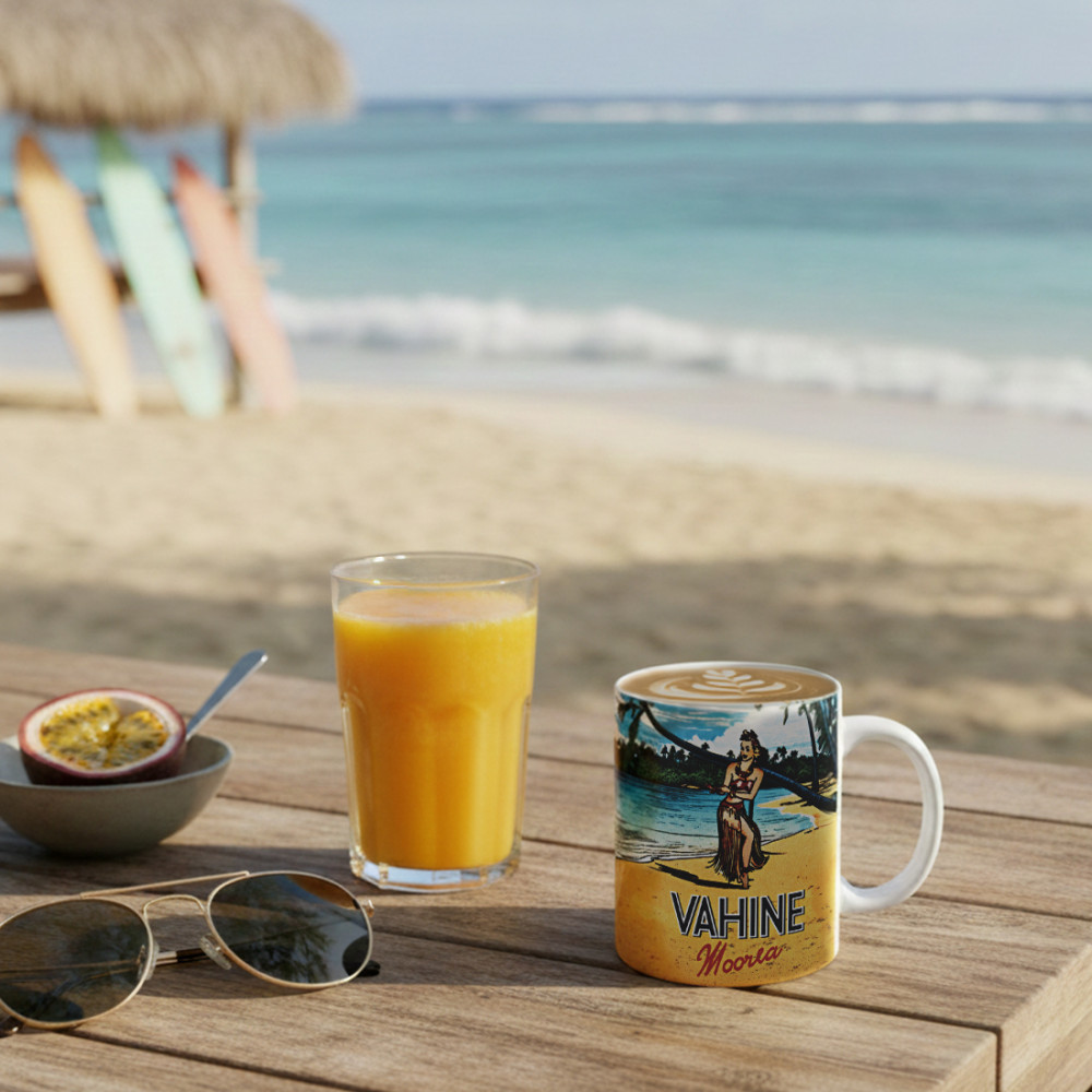 Faites entrer un air de vacances dans votre quotidien avec le Mug Vahiné Moorea Mat. Ce mug en céramique au fini mat met à l’honneur l’île de Moorea, joyau volcanique de la Polynésie française. Illustré d’une vahiné élégante sur une plage dorée bordée de cocotiers, ce mug célèbre la douceur de vivre de l’île sœur de Tahiti. Son visuel vintage est imprimé en France, et il est compatible micro-ondes et lave-vaisselle pour un usage pratique et durable.