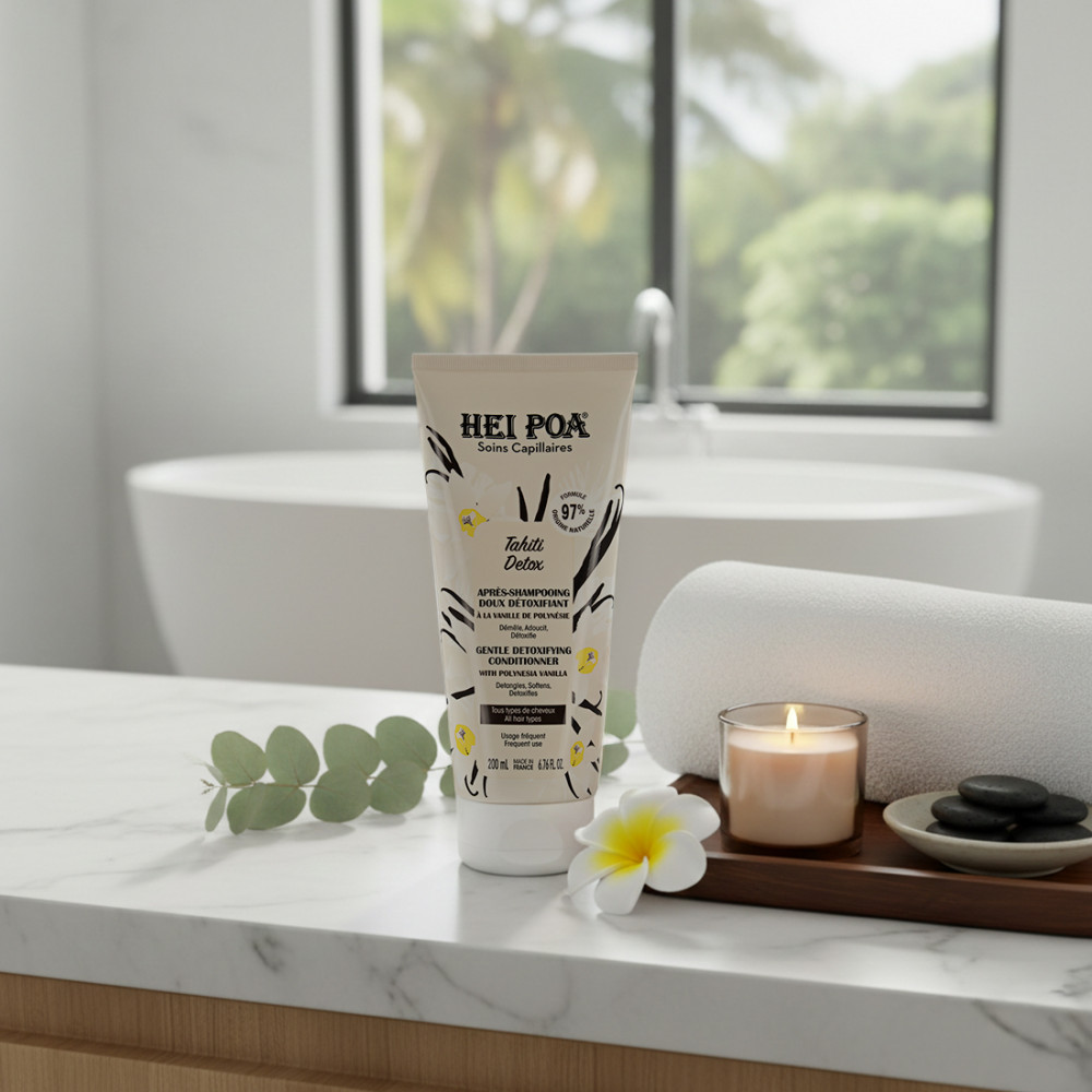 L’Après-Shampoing Tahiti Detox de HEI POA complète idéalement la routine de soin capillaire en apportant douceur, hydratation* et légèreté aux cheveux tout en facilitant le démêlage. Sa formule à base d’actifs naturels inspirés de la Polynésie purifie la fibre capillaire tout en la nourrissant intensément. Enrichi en Vanille Tahitensis et en Vanille Planifolia, connues pour leurs propriétés antioxydantes et régénérantes, cet après-shampoing agit en douceur pour restaurer la brillance et la vitalité des cheveux exposés au stress oxydatif, à la pollution ou encore aux agressions extérieures.