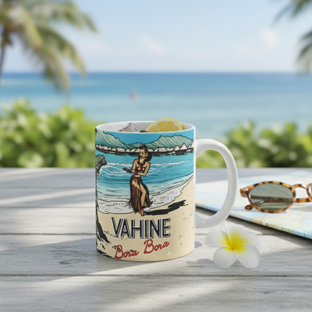 Tauchen Sie ein in die bezaubernde Welt Polynesiens mit der Tasse Vahiné Bora B ora Mat, einem Alltagsgegenstand, der die Flucht aus dem Alltag und den Charme ...
