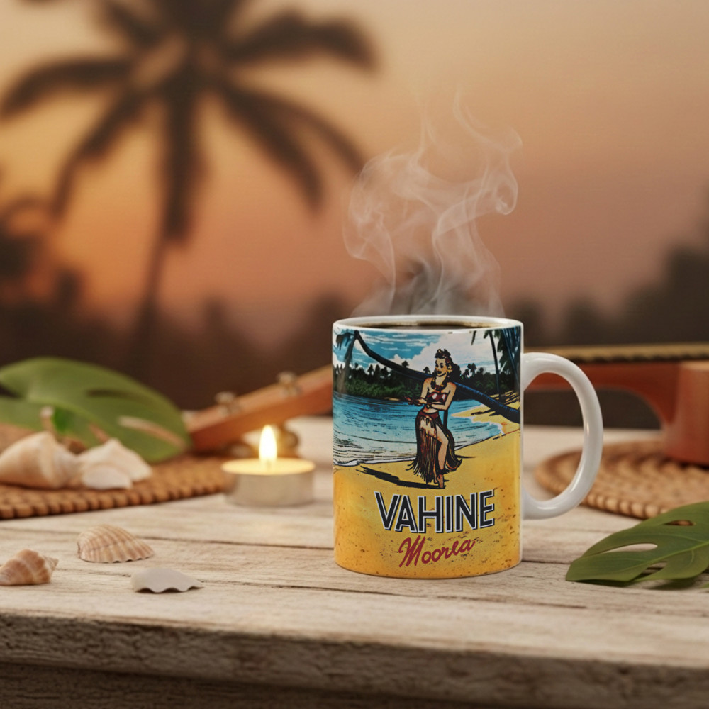 Die Vahiné Moorea Mat Tasse ist eine Hommage an Moorea, eine der schönsten Inseln des Gesellschaftsarchipels. Bekannt für ihre grünen Gipfel, paradiesischen Strände und die Lagune mit ihren tausend Blautönen, inspiriert Moorea hier zu einer Retro-Optik, die von Charme und polynesischer Tradition geprägt ist. Die abgebildete Vahine in ihrer traditionellen Tracht verkörpert die Anmut, Weiblichkeit und Gastfreundschaft, die der tahitischen Kultur eigen ist.