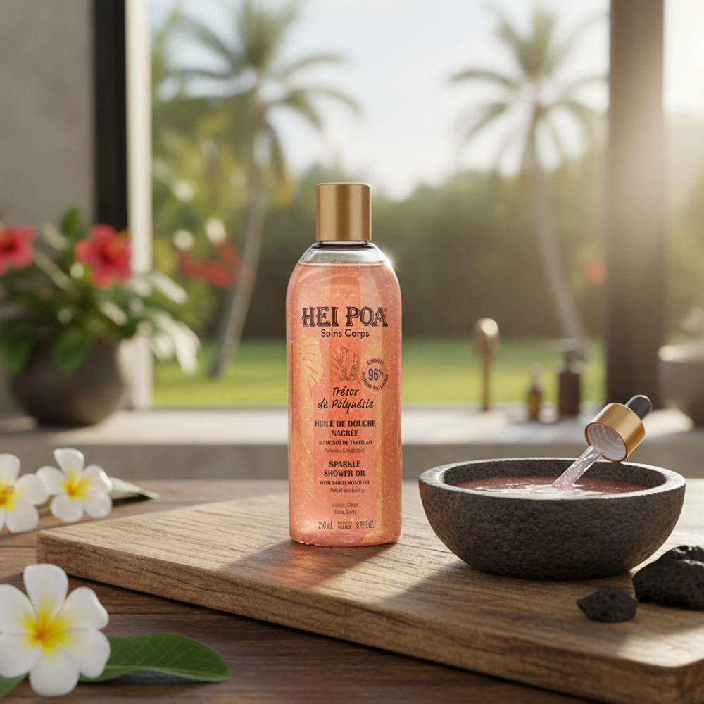 Verwandeln Sie Ihr Duschritual in einen wahren Moment der Sinneserfahrung mit demperlmuttfarbenen Duschöl Trésor de Polynésie mit Signatur Hei Poa. Dieses mit Tahiti-Monoi angereicherte und zart nach Tiaré-Blüten duftende Perlmutt-Öl reinigt die Haut, nährt sie und verleiht ihr ein strahlendes Aussehen. Dank seiner seidigen Textur, die sich bei Kontakt mit Wasser in einen milchigen Schleier verwandelt, umhüllt es die Haut mit einem satinierten Finish und respektiert dabei ihr natürliches Gleichgewicht. Eine sensorische Waschpflege, ideal für alle Hauttypen, die täglich Feuchtigkeit* und Ausstrahlung benötigen.