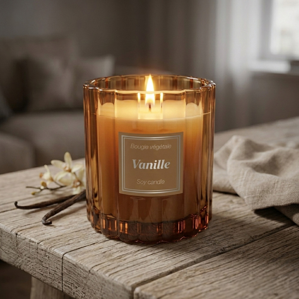 Bringen Sie eine warme und raffinierte Atmosphäre in Ihr Zuhause mit dieser pflanzlichen Kerze mit Vanilleduft, die bis zu 50 Stunden Brenndauer bietet. In ihrem eleganten Behälter aus Braunglas mit Holzdeckel vereint sie Ästhetik und olfaktorisches Wohlbefinden. Sein süßer, umhüllender Vanilleduft schafft eine kokonartige Atmosphäre, die ideal für Momente der Entspannung ist. Die aus pflanzlichem Wachs hergestellte Kerze brennt sauber und gleichmäßig ab und eignet sich daher perfekt, um Ihre Dekoration zu verschönern und gleichzeitig einen köstlichen und beruhigenden Duft zu verbreiten.