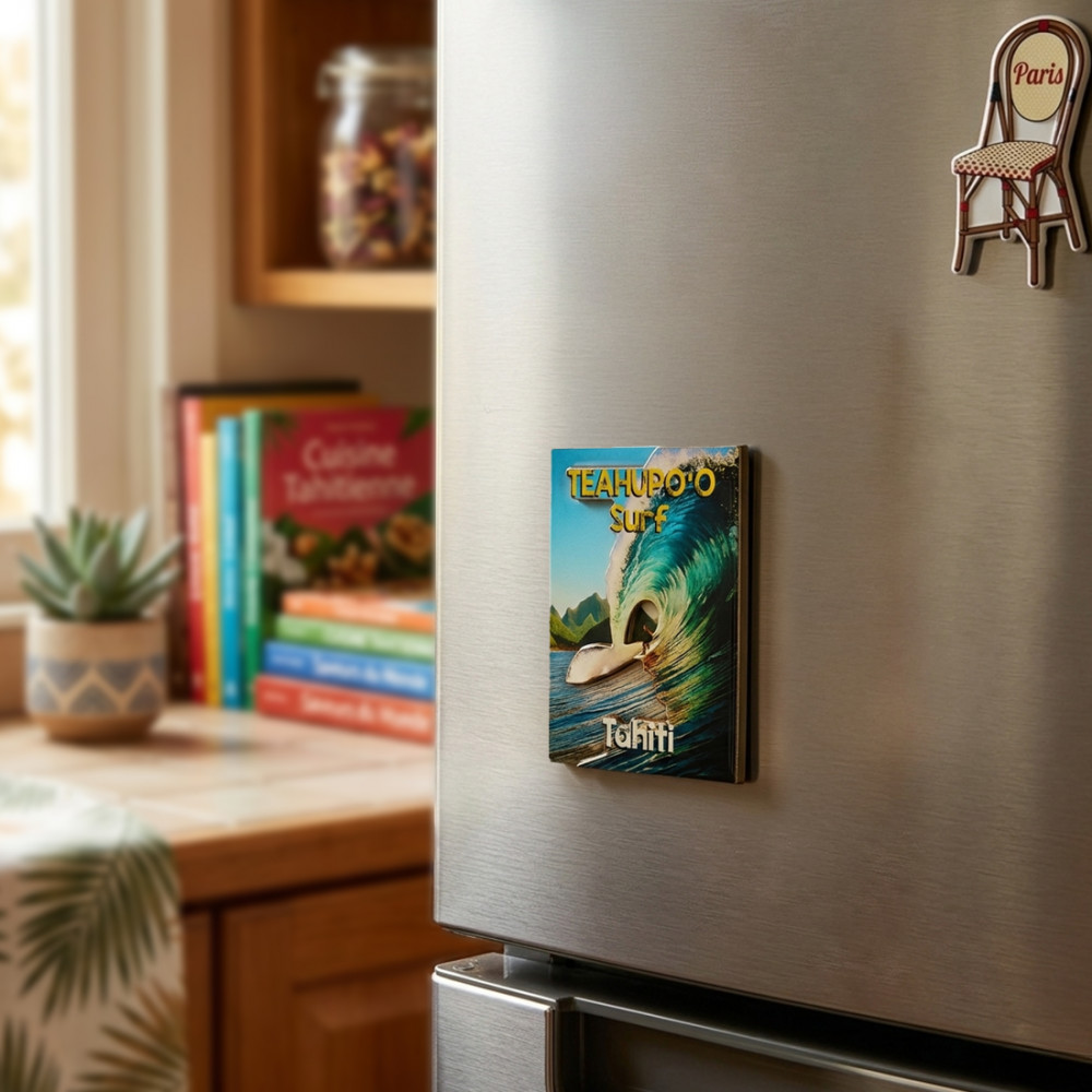 Bringen Sie mit diesem rechteckigen Magneten Teahupo'o, der vom berühmten Surfspot auf Tahiti inspiriert ist, einen Hauch von exotischer Flucht in Ihr Zuhause ...