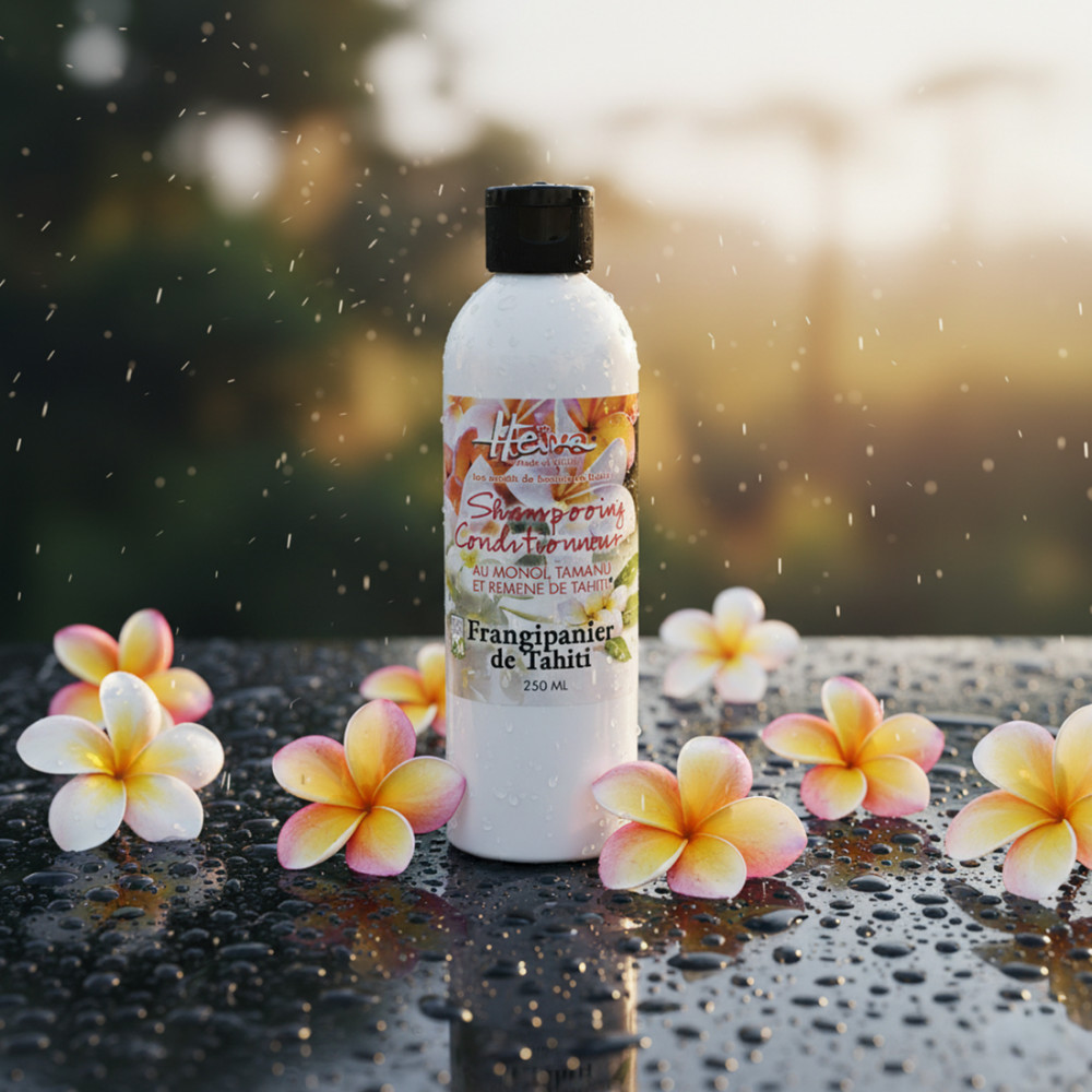 This conditioning shampoo with Monoï and Frangipani from Tahiti, enriched with natural active ingredients, is the secret to revealing the beauty and vitality of your hair while enjoying a moment of sensory escape, directly inspired by Polynesian care rituals.