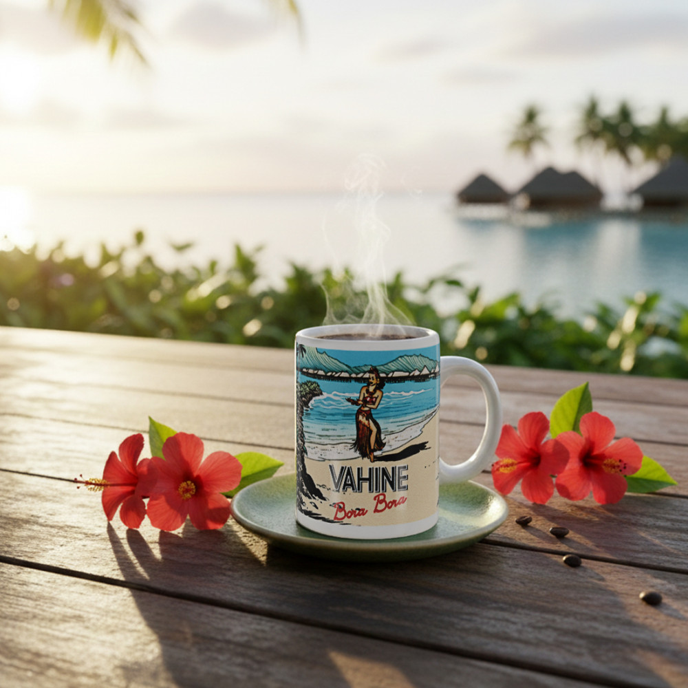 La taza de café Vahiné Bora B ora te transporta a las soleadas playas de la Polinesia a primera hora de la mañana. Su exclusivo diseño vintage, inspirado en los carteles de viajes retro, muestra un vahiné tradicional en un encantador entorno tropical, con los famosos bungalows sobre pilotes de Bora Bora como telón de fondo. Esta taza no es sólo un objeto cotidiano, sino un auténtico accesorio decorativo que invita a evadirse.