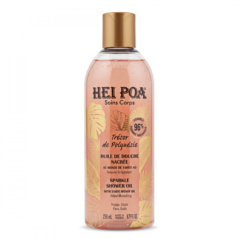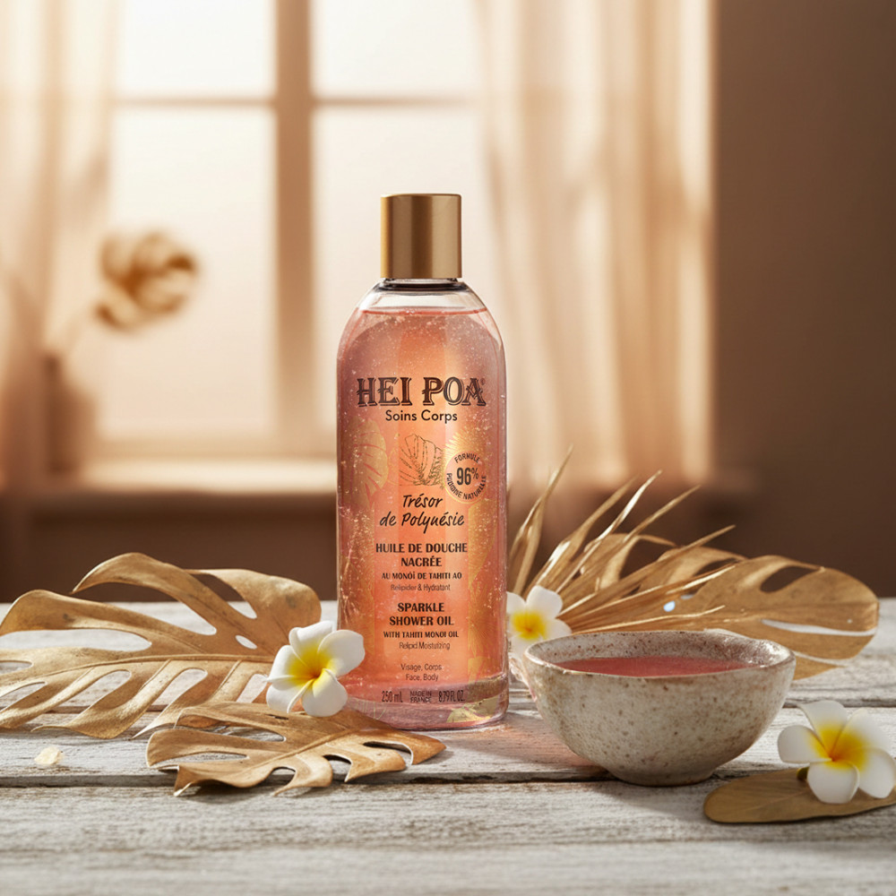 Transforme su ritual de ducha en un verdadero momento de evasión sensorial conel Aceite de Ducha Nacarado Trésor de Polynésie, firmado Hei Poa. Enriquecido con Monoï de Tahití y delicadamente perfumado con flor de Tiaré, este aceite nacarado limpia la piel al tiempo que la nutre y la ilumina. Gracias a su textura sedosa, que se transforma en un velo lechoso al contacto con el agua, envuelve la piel en un acabado satinado, respetando su equilibrio natural. Un limpiador sensorial, ideal para todo tipo de pieles que buscan hidratación* y luminosidad a diario.