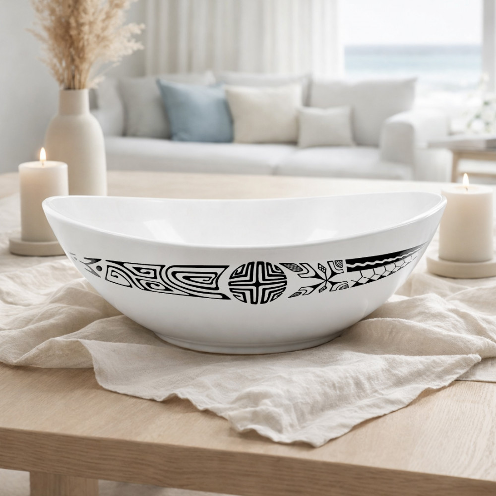 Aporta un toque de elegancia exótica a tu mesa con esta ensaladera de melamina decorada con un tatuaje polinesio. Su moderna forma ovalada, con bordes ...