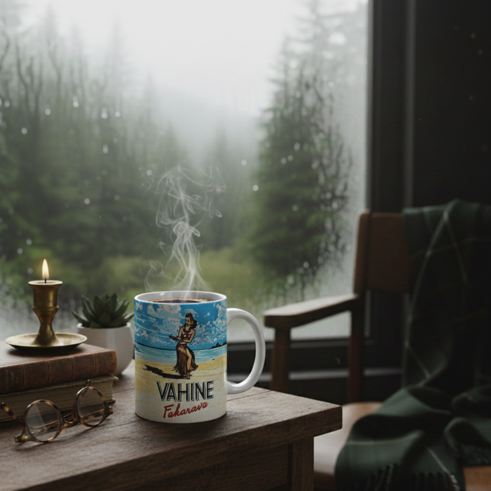 Il Vahiné Fakarava Mat è un omaggio a uno degli atolli più belli della Polinesia francese, classificato come riserva della biosfera dall'UNESCO. Con la sua sabbia bianca, le lagune cristalline e la natura incontaminata, Fakarava è una destinazione da sogno per gli amanti dell'autenticità. Questa tazza cattura tutta la poesia dell'isola con un'illustrazione retrò di una wahine nel suo ambiente naturale, in uno stile vintage che ricorda i poster di viaggio degli anni Cinquanta.