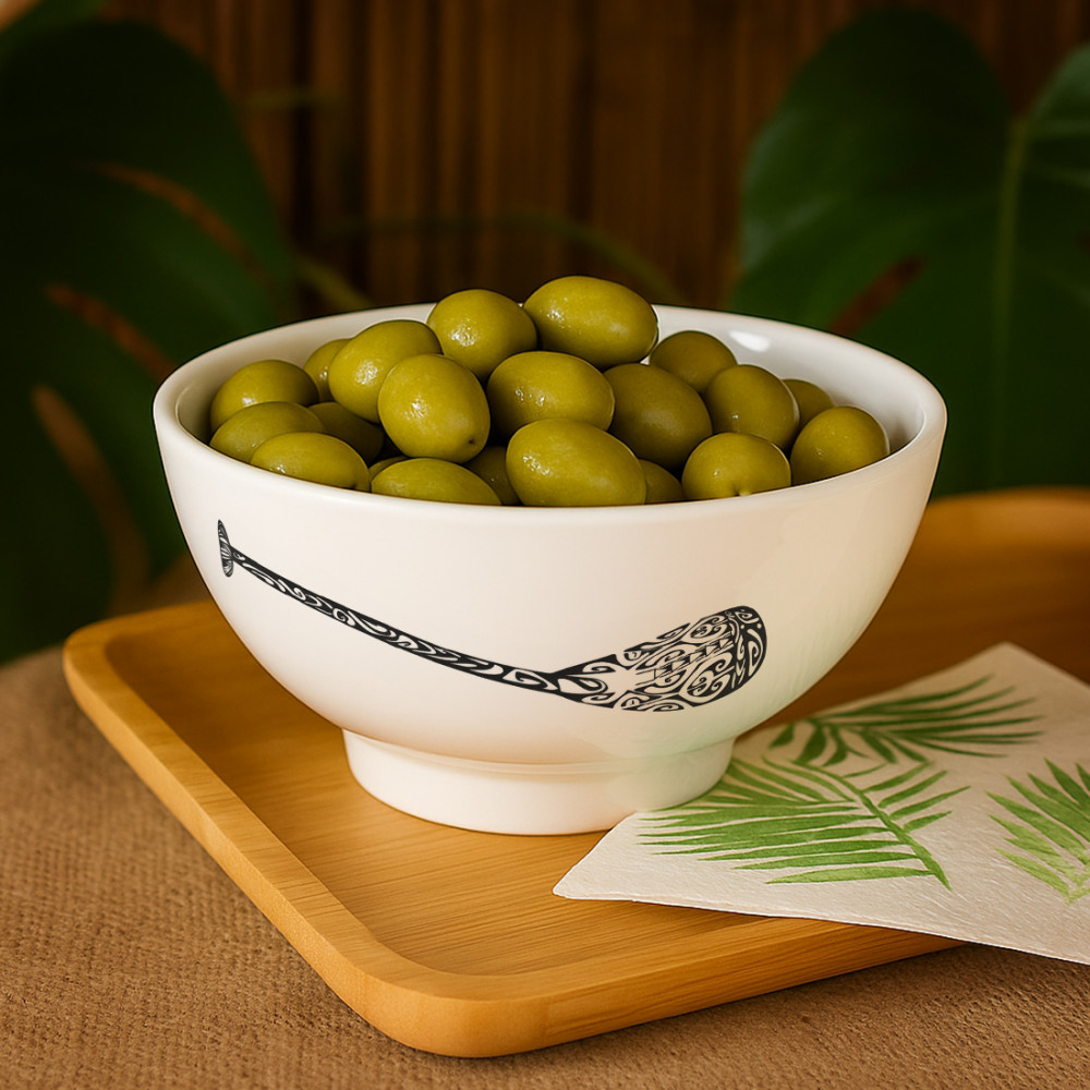 Elemento central da vida tradicional das ilhas, o remo simboliza a viagem, a força e a ligação entre os povos do Pacífico. Leve, robusta e fácil de cuidar, esta tigela é ideal para o uso quotidiano ou para refeições em movimento, ao mesmo tempo que traz uma autêntica estética tribal à sua mesa.